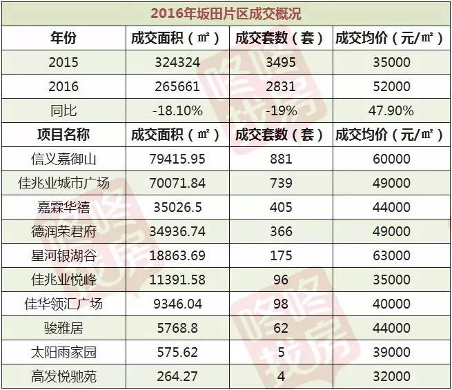2016年坂田片区楼市继续保持高度活跃,其中信义嘉御山和佳兆业城市广场是片区的重要量价支撑者。片区内10个项目共成交265661平方米/2831套,同比减少近两成;成交均价同比上涨47.9%,为52000元/平方米。