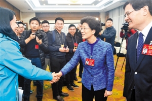 省人大常委会主任李玉妹与报道全国两会的广东媒体记者亲切握手。 深圳商报特派记者 林晓斌 摄