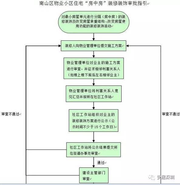 (二)对于涉及改变分隔的装修装饰工程(如增设房间单元)及改变房屋承重结构、改变房屋使用功能的装修装饰活动,物业服务企业应于装修前根据《南山区物业小区住宅“房中房”装修装饰审批指引》中规定会同装修申请人就装修方案征求房屋相邻关系人意见。 征得相邻关系人同意后一并汇总报送至辖区社区工作站,并于小区进行公示,公示时间不少于15日。