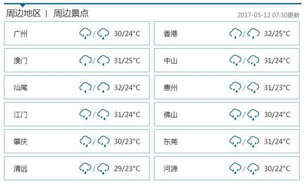 预计深圳今日多云为主,早晚有轻雾,有局地雷雨,气温25℃-32℃,东风2-3级,空气相对湿度60%-90%;13日有中到大雨局部暴雨,并伴有雷暴和8级左右的短时大风;14日降雨减弱;15-16日再有一次明显降雨过程;17日有分散阵雨。