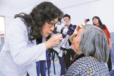 市眼科医院专家深入社康中心,为社区老人检查白内障术后老人的恢复情况。