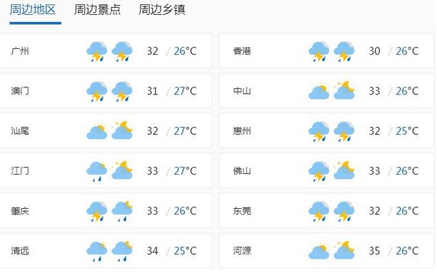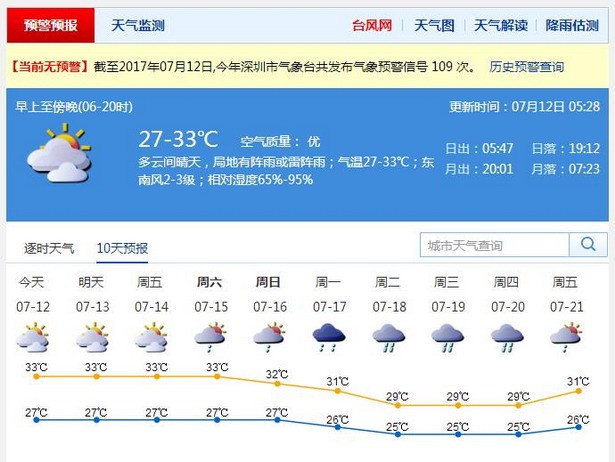 深圳新闻网讯 10日夜间到11日白天,我市多云间晴天,局地有短时阵雨或雷雨,截至11日16时全市最大降雨出现在梅林水库站,为30毫米;早晨最低气温普遍在27℃左右,最高气温33℃-34℃之间;南风2-3级;全市能见度普遍在10公里以上。