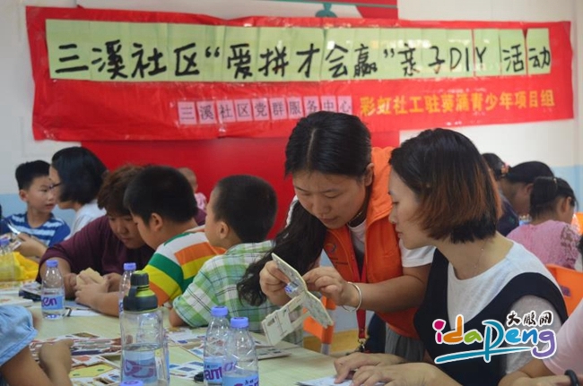 活动伊始,社工向参加者介绍了文明知识,随后,在亲子DIY环节,社工带领每一组家庭成员开展手工活动——拼房子,现场,大手携小手,每一位家庭成员动手动脑,集中注意力,相交流并进行分工合作,玩得不亦乐乎。
