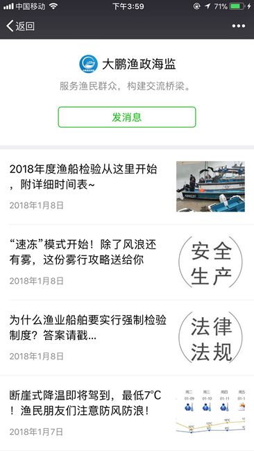 深圳新闻网1月9日讯(记者 黎阳 通讯员 罗树行 袁丽娜)轻触手机屏,就能随时查看海上安全知识、掌握渔政办事指南。日前,“大鹏渔政海监”微信公众号正式上线,为广大渔民和市民朋友搭建了一座服务的桥梁。
