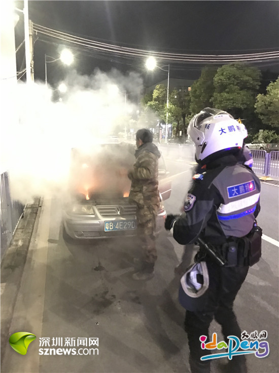 深圳新闻网1月13日讯(记者 古亮宇 通讯员 林祺 廖欣)日前,大鹏公安分局机动训练大队葵涌铁骑巡逻组巡至金葵中路时,发现一辆正在行驶的白色小车隐约正冒白烟,然而粗心大意的司机并没有察觉出异样,完全没有减速的迹象。眼看着白烟渐浓,安全隐患不容迟疑,带队人陈超当机立断,在同事协助下超车将该车拦停。