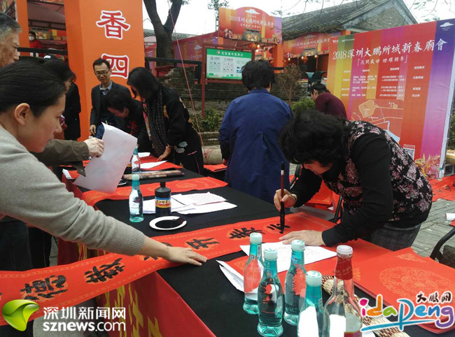 昨日,在大鹏所城北门广场,现场一片喜气洋洋,12位女书法家为居民和游客现场写春联,送去新年祝福。