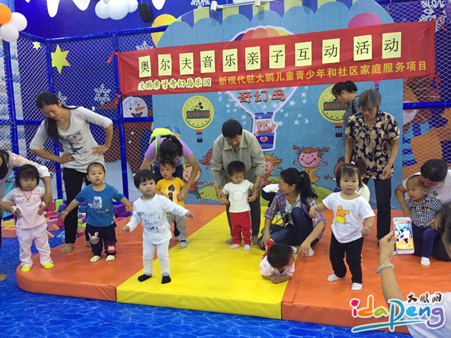 据悉,本次参与者均为大鹏办事处辖区内1.5-2.5岁幼儿,该阶段正是幼儿语言及肢体动作的敏感期,外界良好的刺激能促进幼儿身心健康发展。为此,奇幻岛亲子乐园讲师安排了奥尔夫音乐体验活动,主要是跟随音乐及讲师的引导来带动家长及幼儿共同随音律而做出相应的动作。首先讲师用音乐问好,其次带领膝上童谣《黑母鸡》;音乐手指谣《逗笑的小熊》、《捏拢放开》;音乐体操:《打气》、《坐电梯》;音乐游戏:《我的朋友在哪里》等环节,每个环节幼儿都模仿得惟妙惟肖,特别是《坐电梯》环节,家长抱着小孩子根据故事情节及音乐一上一下进行模拟及互动,让现场的儿童开心不已。