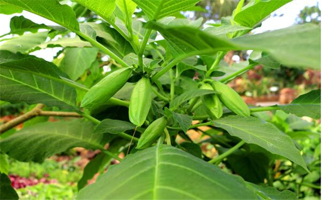 秋葵果实形似辣椒,曼陀罗花谢后结的果实为球状。