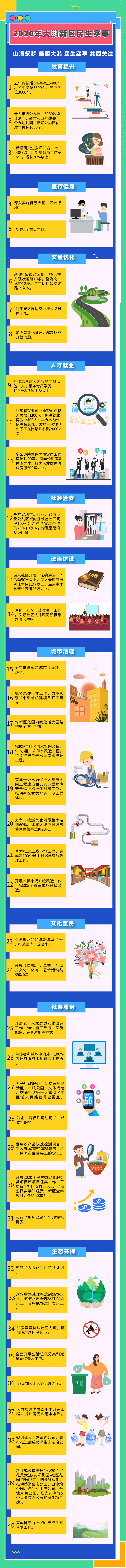 2020年大鹏新区将推出40项民生大事,涉及食品安全、教育提升、医疗健康、交通出行、住房保障、人才引进、营商环境等10个方面。
