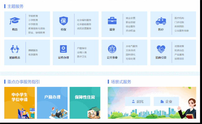 “场景式服务”基于大数据分析,制定“居民”“企业”两大场景式服务,群众可根据自身角色查看个性化页面,快速获取所需内容,让政府网站真正做到为群众贴心服务,增强群众和企业的获得感。同时,根据群众网上办事的热度和关注度,新版网站在现有的“中小学生学位申请”“户籍办理”“保障性住房”等重点领域信息基础上,选取与公众密切相关的“计划生育证明”“老年人服务”两大重点领域专题,通过聚合相关服务信息,实现服务资源一站提供、一页纵览,确保群众“找得到、办得成”。