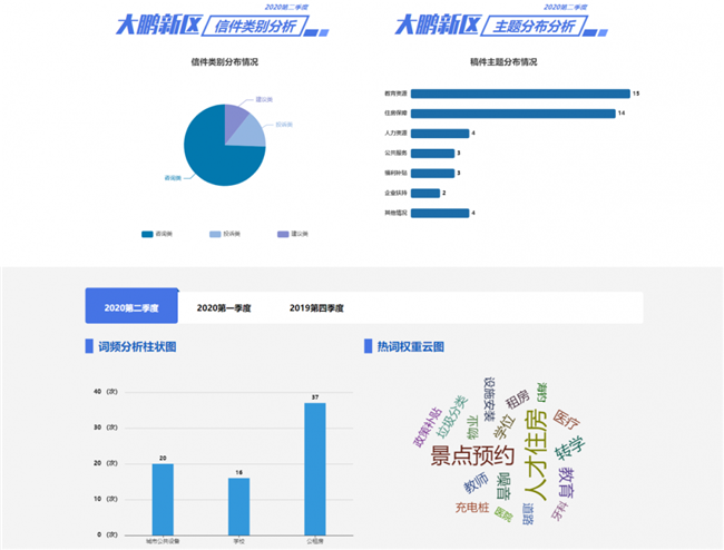 “大数据留言分析”旨在运用大数据技术对公众留言信件进行多维度分析,通过对网站存量公众留言信件进行深度挖掘分析,形成了各时间段内公众留言信件的词频分析柱状图和热词权重图。除此以外,还进行了信件类别分析、信件主题分析、答复时间分析、信件篇幅分析、关注焦点分析,更好地听民声,察民情,解民忧,惠民生,推动科学决策、民主决策,提升社会治理能力。