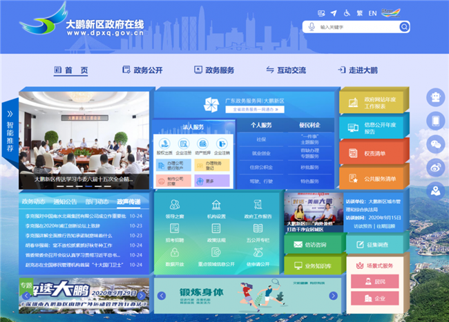见圳客户端•深圳新闻网10月26日讯(见圳客户端、深圳新闻网记者 凌安儿 通讯员 曾媛 吕绍雄)随着大鹏新区政府门户网站英文版顺利改版上线,近日,大鹏新区政府门户网站也迎来全新升级改造并正式上线运行。大鹏新区政府门户网站以打造网上政务最前端的“窗口”为目标,以创新服务、拓展应用、便民利民为主线,探索以“互联网+政务”新模式构建集网上办事、政府信息公开、便民服务、政民互动等功能于一体的智慧型网上政府,促进政府职能转变,推进政府治理能力现代化。