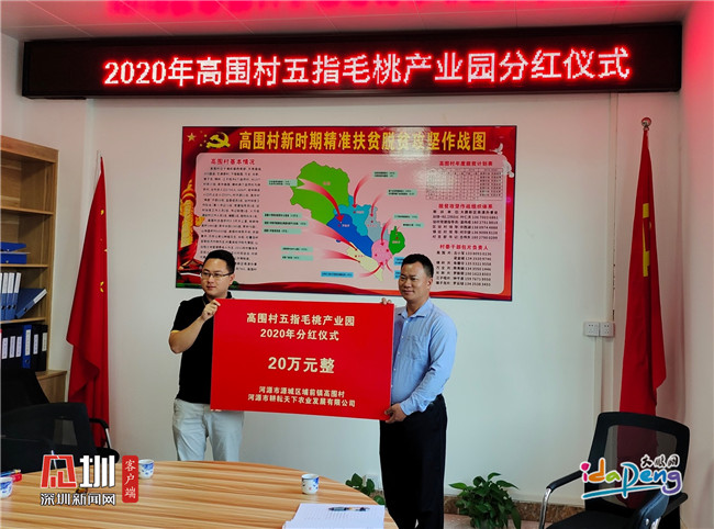见圳客户端·深圳新闻网11月9日讯(见圳客户端、深圳新闻网记者 黎阳 实习记者林宏松 通讯员 叶仁天 报道)近日,高围村举办了五指毛桃产业园2020年分红仪式,南澳办事处派驻干部从产业园经营方手中接过沉甸甸的20万元分红,这是自2019年12月该产业项目以来第一次项目分红,按照分配方案,将为高围村贫困户68户各增收2000余元,村集体年收益增收6万元。该驻村干部表示,五指毛桃产业园的落地实现了高围村产业“零突破”,为高围村贫困户实现脱贫攻坚的目标锦上添花,项目分红的分发进一步保障了贫困户的脱贫质量,树立了贫困户摘掉贫困帽子的信心,激发了贫困户致富奔小康的积极性和主动性。