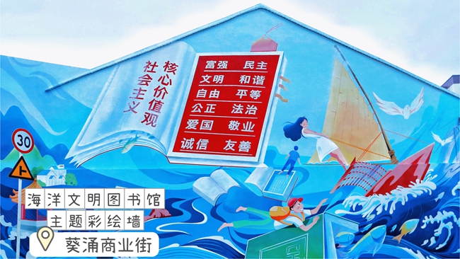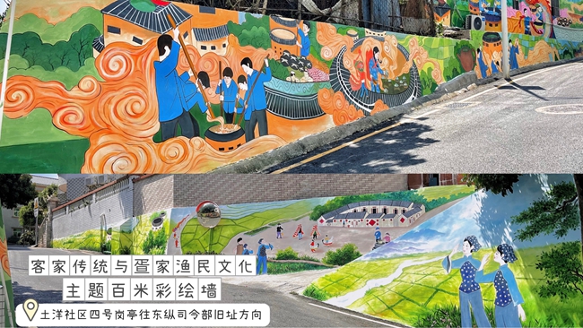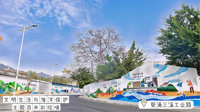 从文明生活到海洋保护,从客家传统到疍家渔民文化……这些彩绘墙描绘了东纵司令部旧址、东纵北撤纪念亭等红色地标,此外,葵涌“一线七点”重走东纵路红色精品教育路线也贯穿其中。
