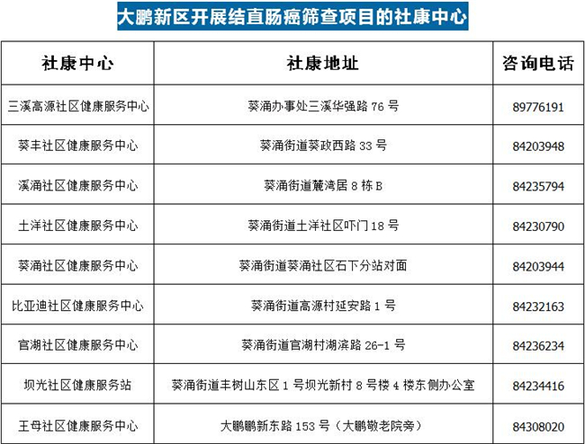 大鹏新区45-74岁居民结直肠癌筛查项目正式启动,符合条件的45-74周岁(以身份证上出生日期为准)大鹏新区常住居民(居住3年以上),可持身份证到就近社区健康服务中心参加。