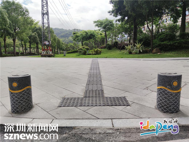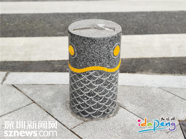 为确保人行道改造效果协调美观,经过多次现场调研,参考周边公园绿道、社区广场的城市家具和地面铺装,比对住宅小区、工业园区楼体外立面配色,结合周边绿化情况,充分开展选色论证。最终选定与周边环境设施更加协调的芝麻蓝调灰色面砖作为主体铺装,衬以黑色盲道砖的配色方案。通过近似色和对比色的巧妙运用,让整体观感简约大气、精致细腻。此外,该路段无障碍坡道口均采用独具大鹏风格的特色车止石,将“鲲”“鹏”元素融合进车止石整体形象设计,寓意大鹏蜕变与发展。