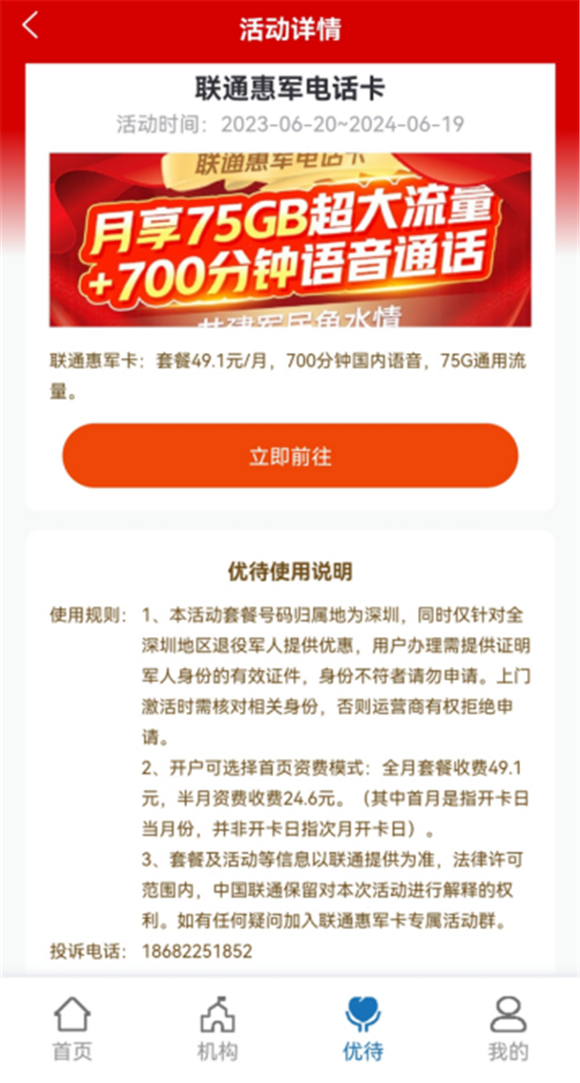 深圳地区持优待证退役军人可享受退役军人专属优惠套餐:新入网49.1元月租,含全国语音700分钟 ,全国流量75G,全国接听免费。套餐超出收费:流量1元1GB,语音0.1元/分钟,号码归属地深圳。以上优惠需登录“鹏城老兵”APP线上办理,也可致电18682251852咨询。