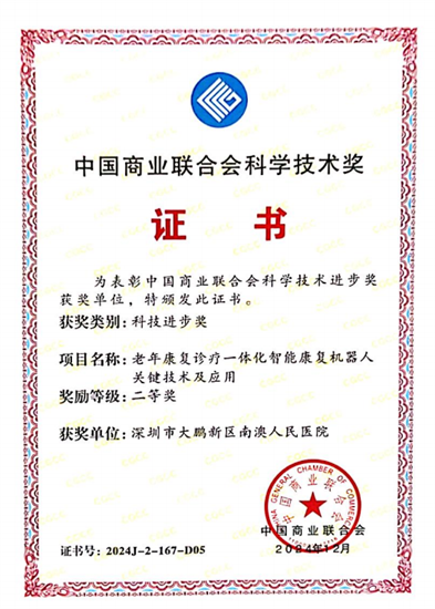近日,深圳市第二人民医院大鹏新区南澳医院申报的“老年康复诊疗一体化智能康复机器人关键技术及应用”项目,荣获中国商业联合会科学技术奖“科技进步奖二等奖”。