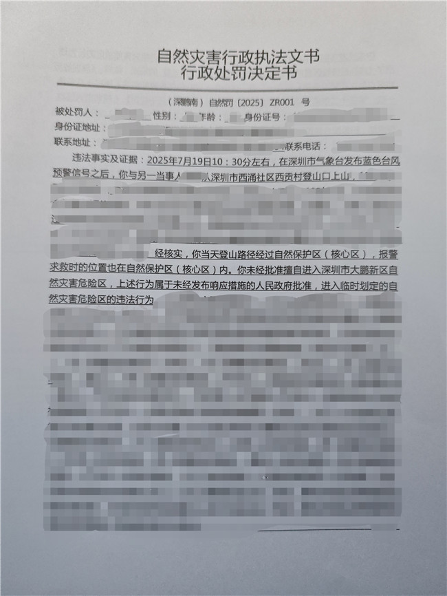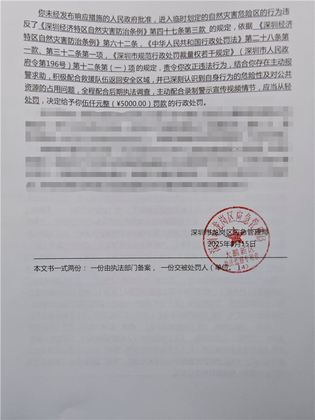 据大鹏新区应急管理局工作人员介绍,大鹏新区山海资源禀赋优异,长期以来吸引大量游客前来游玩。然而,部分游客心存侥幸,在台风、暴雨等灾害天气下不顾劝阻、以身犯险的情况屡有发生,为新区自然灾害应对工作带来挑战。根据《深圳经济特区自然灾害防治条例》规定,市、区人民政府可以将可能造成人员伤亡或者重大财产损失的区域临时划定为自然灾害危险区,并采取禁入措施,违者可能面临5000元以上20000元以下罚款,并承担相关救援费用。2025年6月,大鹏新区经过专家评审及两次公开征求意见,于全市率先划定自然灾害危险区。大鹏半岛市级自然保护区(核心区)、深圳大鹏半岛国家地质公园及大鹏新区管辖海域范围,在满足特定自然灾害预警的情况下,将被临时划定为自然灾害危险区。2025年7月19日,台风“韦帕”蓝色预警信号发布后,南澳街道办事处发现仍有游客擅自登山进入自然灾害危险区导致被困,最终在救援人员12小时的艰苦努力下被成功转移至安全区域,此时台风“韦帕”已升级为橙色预警。经过相应程序,8月15日,南澳办事处依法对两名游客处以每人5000元罚款。
