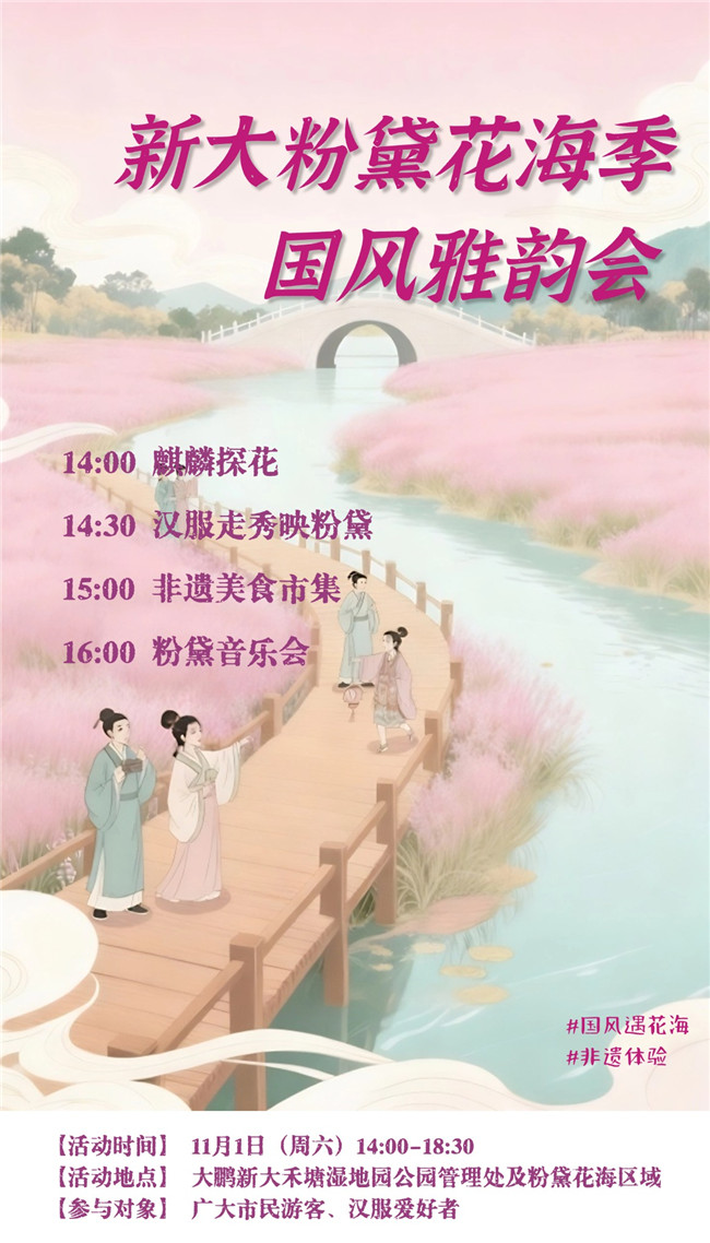 粉黛花开正当时,国风雅韵待君赏!诚邀您与亲朋挚友,身着古风华裳,共赴南澳新大禾塘湿地园,漫步粉色花海,定格秋日最浪漫的国风画卷!