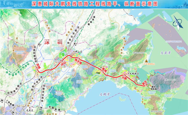 深惠城际大鹏支线途经龙岗区、坪山区、大鹏新区等3个区(新区),共设龙城站、坪山站、燕子湖站、葵涌站、大鹏站、新大站等6座车站和新大车辆基地,全线长39.4公里,采用城际铁路制式,设计时速160公里/小时。预计建成后,通过与深惠城际、深大城际的衔接,实现大鹏新区与市中心城区、重大对外交通设施间的快速联系,有效缓解大鹏新区节假日客流的交通压力。