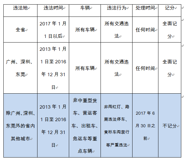 2013年1月1日至2016年12月31日,涉及广东省重点地区(广州、深圳、东莞)、重点车辆(中重型货车、营运客车、出租车、危运车)的违法行为以及闯红灯、路肩违法停车、黄标车闯禁行等严重违法行为,当事人2017年1月1日后接受处理的,执行原有的记分政策。