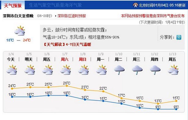 据市气象台预报,深圳平均入冬时间是1月13日,未来4-7日气候依旧温暖。本月深圳市的气候特点将呈现“前暖后冷,春节前有2次降温”的趋势,月平均气温会比同期气候值略高,本月中下旬会有2次较强冷空气,届时将出现3-5天10℃及以下的寒冷天气。(记者晏婵婵)