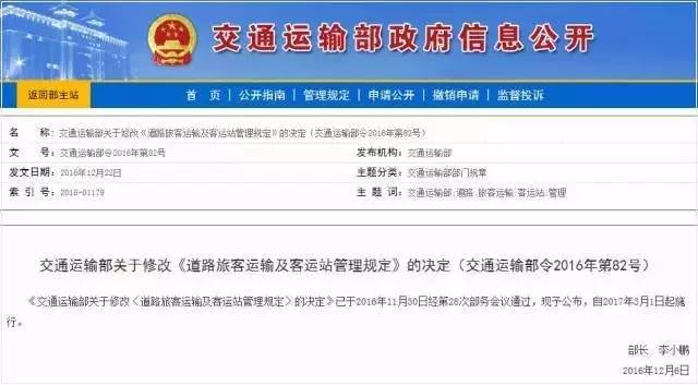 交通运输部近日发布关于修改《道路旅客运输及客运站管理规定》的决定,将从2017年3月1日起,对省际、市际客运班线全面实施客票实名售票和实名查验, 届时长途汽车票也会和现在的火车票一样,印上乘客的身份信息。