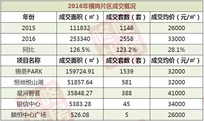 2016年横岗片区高歌猛进,片区项目供求两旺,尤其锦荟PARK单个项目就斩获1539套的成交量。片区5个项目共成交253340平方米/2558套,同比大增1.2倍;成交均价33000元/平方米,同比上涨28.1%。
