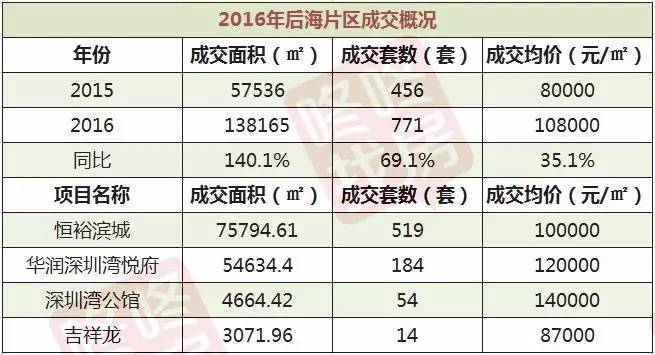 2016年后海片区是深圳楼市的焦点,尤其是新入市项目华润深圳湾悦府,占据城市中心位置,拥有永无遮挡一线海景资源,市场关注度甚高。片区共有4个项目成交,成交面积138165平方米,同比暴增1.4倍;成交套数771套,同比增加69.1%;成交均价108000元/平方米,同比上涨35.1%。