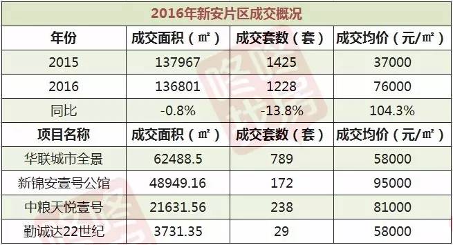 2016年新安片区新入市的新锦安壹号公馆和中粮天悦壹号表现出色,华联城市全景更是片区成交量的主要贡献者。片区内4个项目共成交136801平方米,同比减少0.8%,成交套数1228套,同比减少13.8%,成交均价76000元/平方米,同比翻倍。