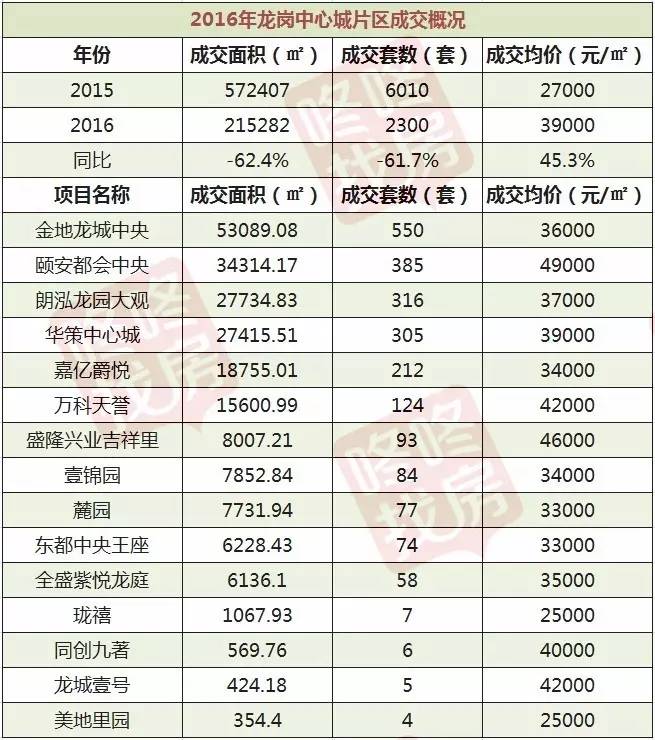 2016年龙岗中心城新增4个项目:朗泓龙园大观、华策中心城、盛隆兴业吉祥里、龙城壹号。片区内的15个项目共成交215282平方米,同比减少62.4%;成交套数2300套,同比减少61.7%;成交均价上涨45.3%,为39000元/平方米。