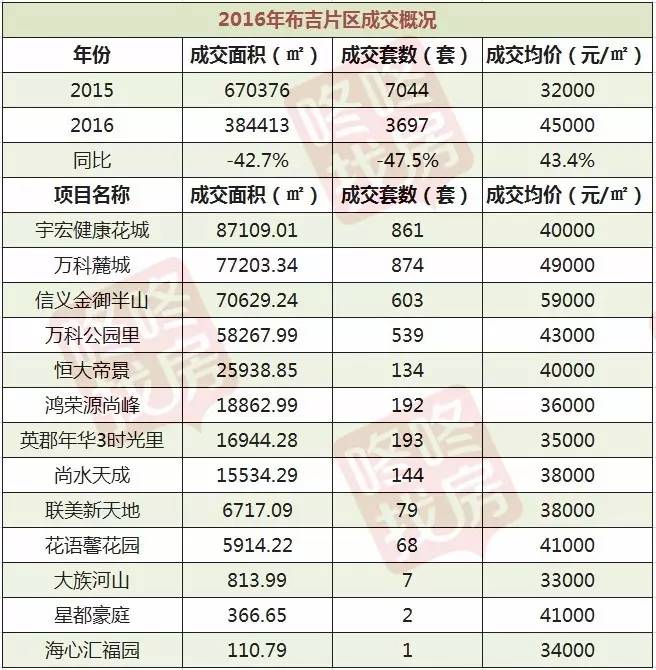 2016年布吉的宇宏健康花城、万科麓城、信义金御半山和万科公园里是片区主要量价贡献者。片区内13个项目共成交384413平方米,同比减少42.7%;成交套数3697套,同比减少47.5%;成交均价45000元/平方米,同比上涨43.4%。