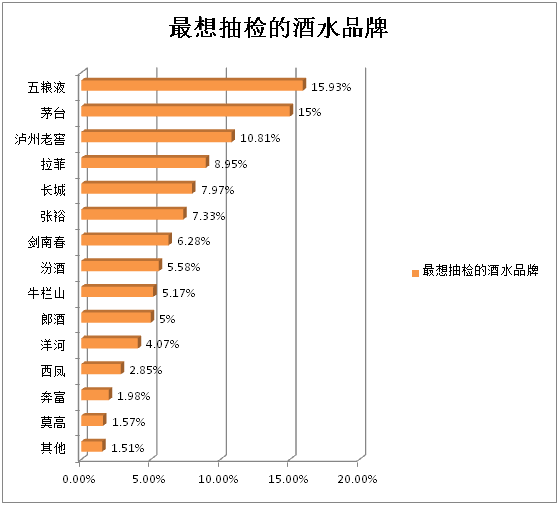 市民最想抽检的酒水品牌是什么?投票数居前五位的酒水品牌是:五粮液、茅台、泸州老窖、拉菲、长城。