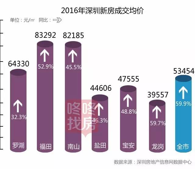 上涨、冲高、振荡、回调……,2016年,高房价的深圳楼市上演了一场惊心动魄的过山车行情,1-9月份,深圳房价螺旋式攀升上涨,其中6月和9月房价突破6万元,进而引发104最严调控新政的出台,新政威慑下的深圳房价显著回落,10-12月房价在55000元上下波动。纵观全年,2016年深圳新房住宅成交均价53454元/㎡,同比上涨59.9%。