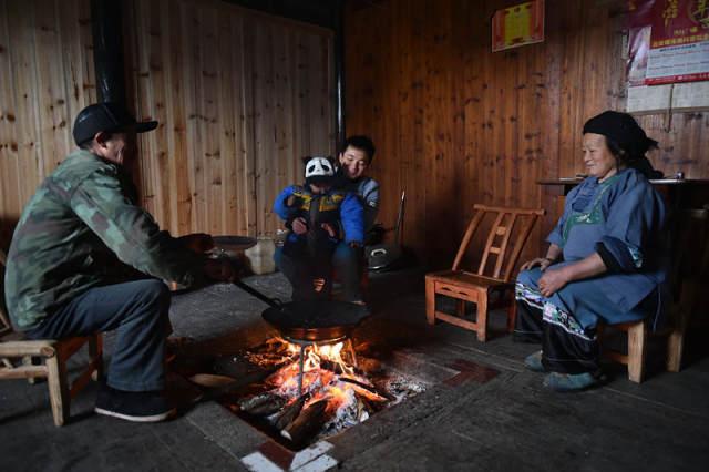 石欣把儿子抱回屋里,在柴火旁取暖。