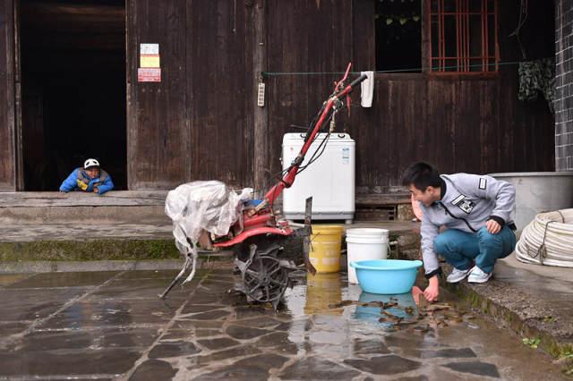 石欣在屋外冲洗自家养殖的黄鳝,儿子趴在门槛上叫爸爸。
