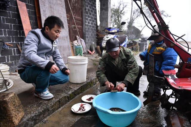 石欣(左一)跟爸爸学破黄鳝的技术,他3岁的儿子也凑过来看。
