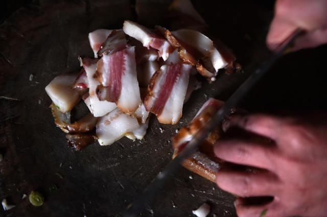 切腊肉,做午饭。这是石欣在外打工时最想念的家乡味道。