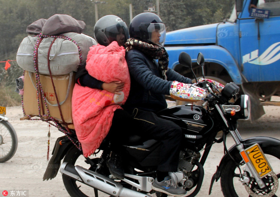 坐油箱绑腰间 铁骑大军春运路上惊险带娃