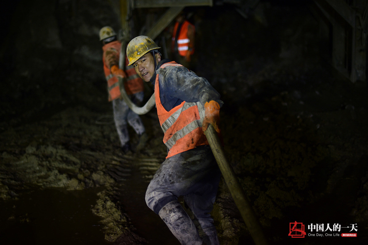 为了防止粉尘,风镐前要加装水管喷水,师傅们正在托运水管。