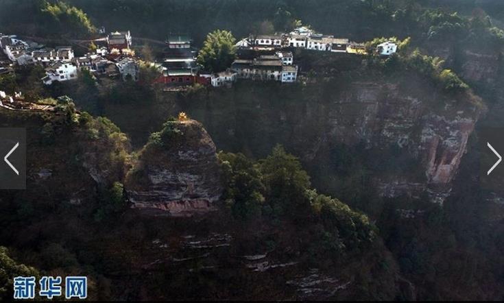 这是建在峭壁上的休宁县齐云山镇齐云山村民组全貌。位于安徽休宁县的齐云山是道教名山,海拔585米,在半山腰的齐云山镇齐云山村民组有一条街道叫月华街,因半悬峭壁之上,被称为“天街”。