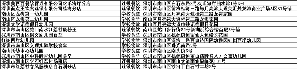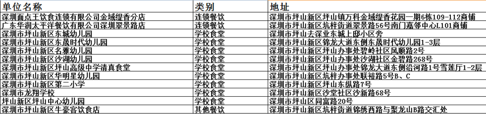 另有3家学校食堂在日常监管过程中发现不符合A级标准,予以降级。其中2家是深圳市坪山新区坪山高级中学食堂,1家是 深圳市翠园中学初中部食堂。