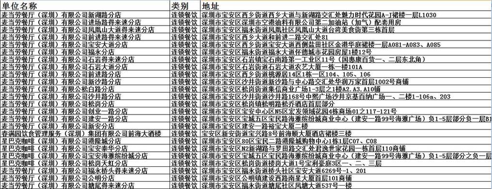 宝安区宝安区新增的A级餐厅有35家,其中30家是连锁餐饮(主要是麦当劳、星巴克、面点王分店)、4家学校食堂、1家机关单位食堂。