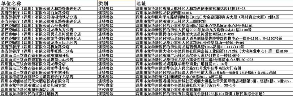 龙岗区龙岗区新增的A级餐厅有22家,全部为连锁餐饮,主要有麦当劳、星巴克、面点王、肯德基、禾绿、汉拿山等。