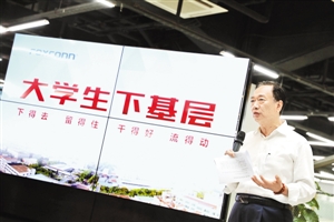 昨日,“大学生下基层”富士康大学生就业座谈会在富士康龙华园区举行,富士康将招募12000名大学生。图为郭台铭喊话大学生:“实体经济大有可为”。深圳商报记者 林晓斌 摄