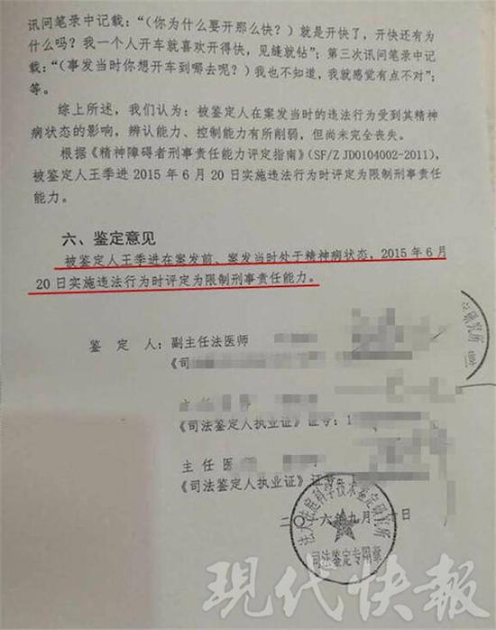 现代快报记者从司法鉴定书上看到,鉴定认为:尽管王季进在案发当时违法行为受到精神病状态的影响,辨认能力、控制能力有所削弱,但尚未完全丧失。该报告最终的鉴定意见为:王季进在案发前、案发当时处于精神病状态,被鉴定人王季进2015年6月20日实施违法行为时评定为限制刑事责任能力。对于此次鉴定报告,受害者双方家属均表示接受,不会再进行第三次的鉴定。