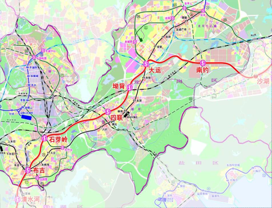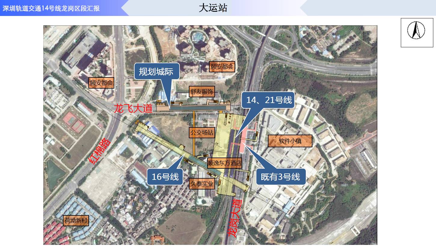 △在大运枢纽沿龙岗大道设大运站,与既有3号线、规划16、21及城际线换乘;