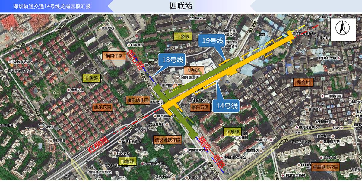 四联站为14、18、19号线的换乘站,14号四联站东西向设于红棉道与横岗一号路交叉路口东北侧。
