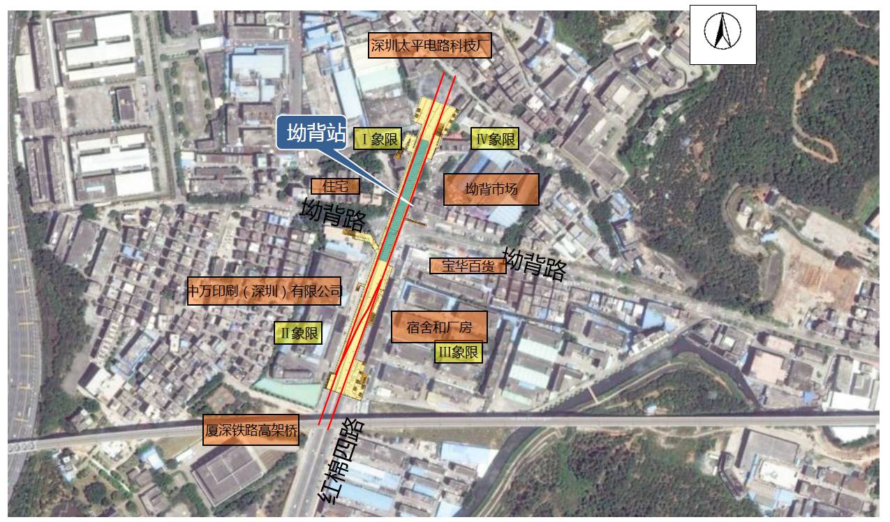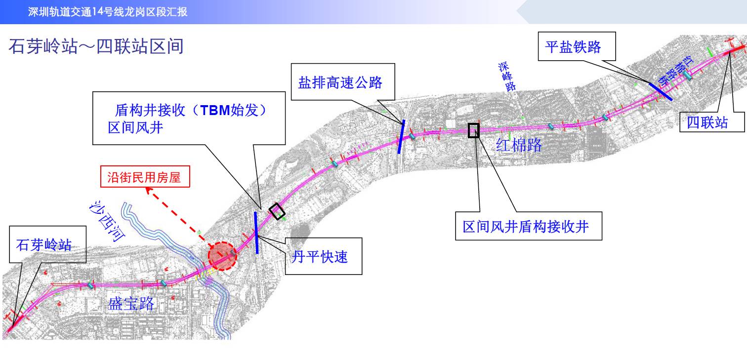 四联站~坳背站区间,区间自四联站出发后,往东北方向敷设,先后下穿贤合小区、茂盛新村、华侨新村、旱塘村、永湖村大面积民房及工业厂房随后拐入红棉三路,沿红棉三路-红棉四路下方敷设到达坳背站。区间下穿房屋群、四联河防洪工程、四联河、厦深铁路等风险点。 区间下穿贤合小区、茂盛新村、华侨新村、旱塘村、永湖村大面积民房及工业厂房,共涉及面积约89530平米。
